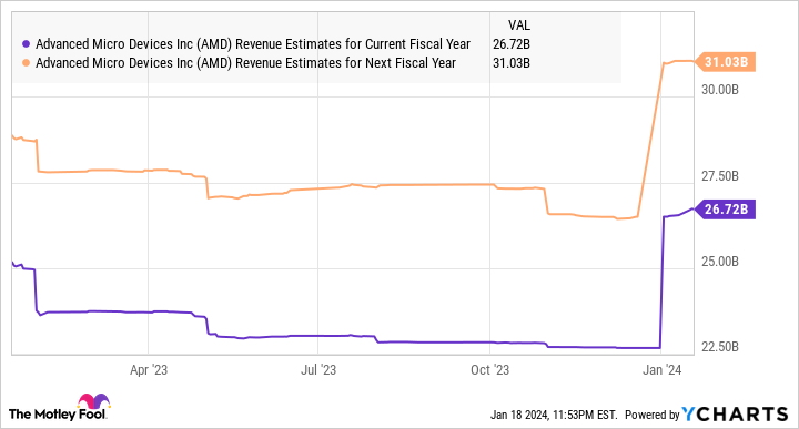 이는 결국 AMD가 2024년에 예상보다 강력한 성장을 달성하는 데 도움이 될 수 있습니다. 분석가들은 현재 AMD의 매출이 올해 거의 18% 증가한 267억 달러에 이어 2025년에는 16% 증가할 것으로 예상하고 있습니다.