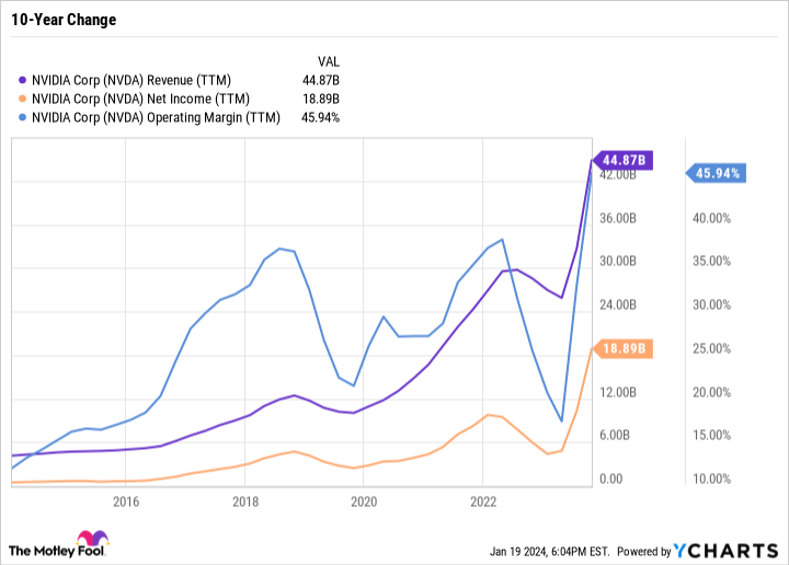 위 도표는 한 회사의 놀라운 위업을 보여줍니다. 불과 1년 만에 엔비디아의 매출은 66.4% 증가했고 순이익은 4배 이상 증가했습니다. 하지만 가장 눈에 띄는 것은 엔비디아의 마진입니다. 449억 달러의 매출에 189억 달러의 순이익을 올린다는 것은 거의 전례가 없는 일입니다. 엔비디아는 매출 1달러당 수익이 너무 많아서 주가수익비율(P/E)을 축소하기 위해 매출을 그만큼 늘릴 필요가 없습니다.
