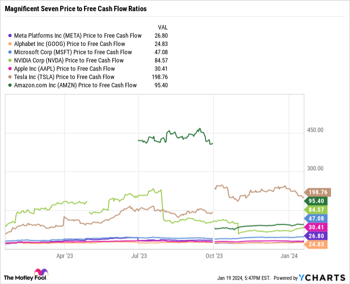 여러분이 페이스북, 인스타그램, 왓츠앱, 또는 메타의 다른 앱들에 대해 어떻게 생각하든, 그 회사가 절대적인 캐시카우라는 것은 부인할 수 없습니다. 사실, 메타는 매그니피센트 세븐의 두 번째로 낮은 가격 대비 무료 현금 흐름 비율을 가지고 있습니다.