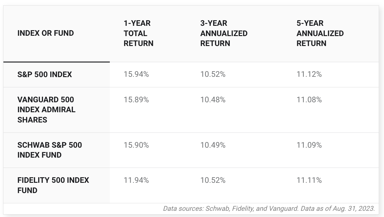 S&P500의 수익률이라면 5년 전 1만 달러 투자는 2023년 중반까지 16,943달러로 성장했을 것입니다. 비교하자면, 피델리티 500 인덱스 펀드에 1만 달러 투자는 같은 기간 5년 동안 16,935달러로 성장했을 것이며, 수수료 때문에 약간의 차이가 있었을 것입니다.