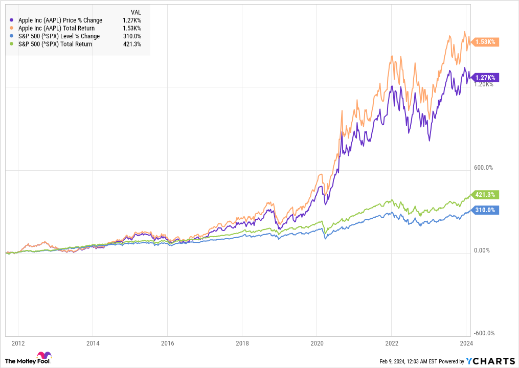 보시다시피, 쿡이 인수한 2011년 8월 이후로 이 주식은 S&P 500을 큰 폭으로 뛰어넘어 1,270% (총 수익률 기준으로 1,530%) 상승했습니다. 이는 쿡의 재임 초기에 애플 주식 10,000달러를 샀던 투자자가 연간 25%의 수익률을 누린 후 오늘날 163,000달러를 갖게 된다는 것을 의미합니다. S&P 500에 동등한 투자를 한다면 오늘날 52,100달러의 가치가 있을 것입니다.
