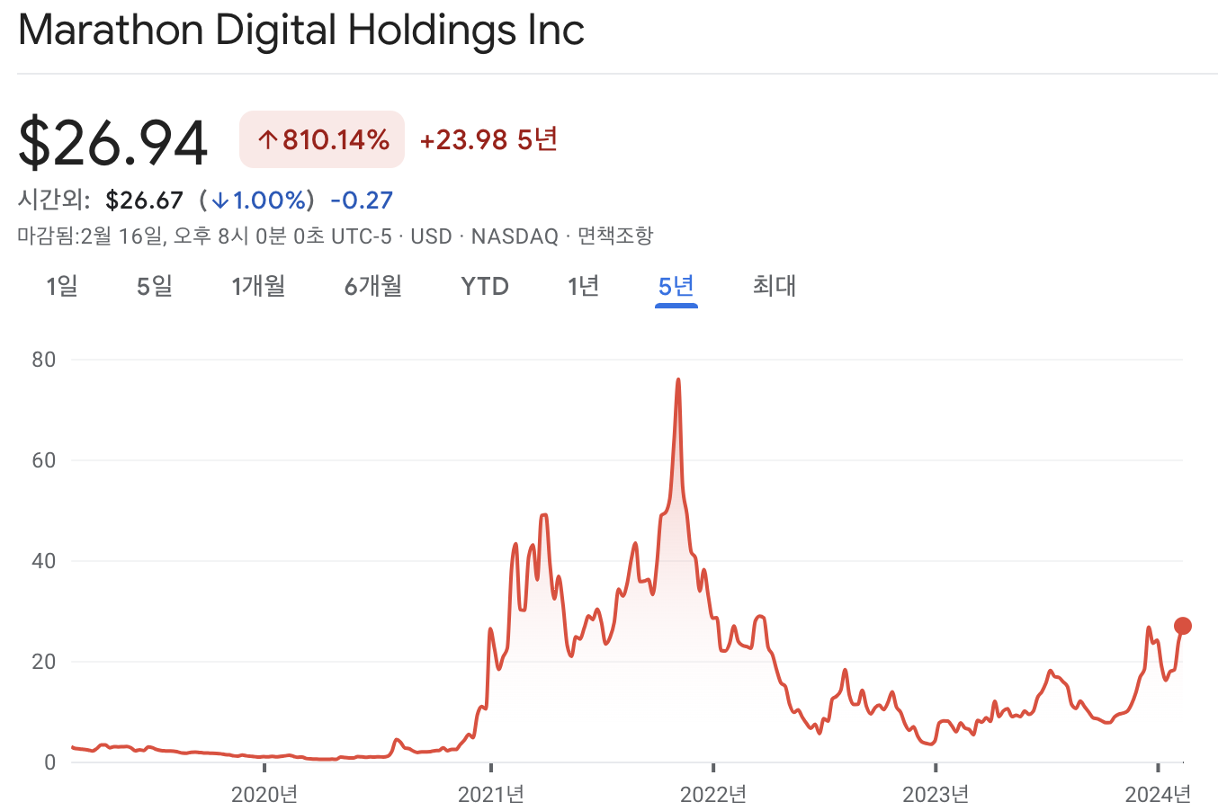 이번 주 비트코인 중심의 상승세에 이어 마라톤 디지털 주식은 지난 한 해 동안 약 239% 상승했습니다.