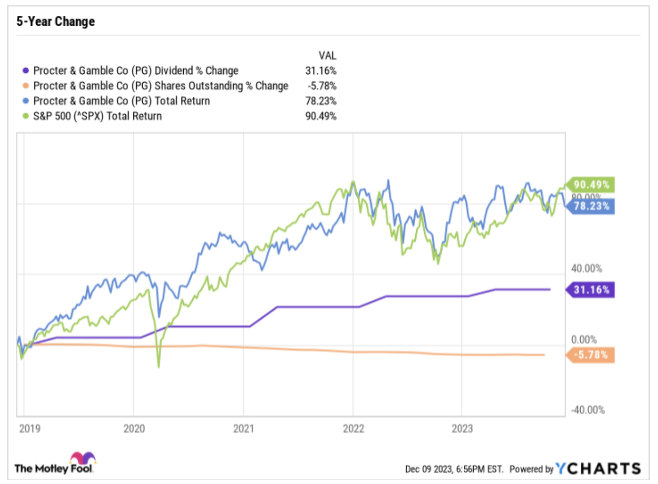 지난 5년 동안 P&G는 투자자들에게 견조한 총 수익(거의 S&P 500만큼 좋은)을 주는 동시에 배당금을 30% 이상 늘리고 주식 수를 5% 이상 줄였습니다.