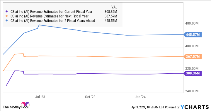 위의 도표는 C3.ai 의 연간 매출이 2026 회계연도에 거의 4억 4,600만 달러로 뛸 수 있음을 나타냅니다. 이 회사는 2023 회계연도에 2억 6,700만 달러의 매출을 올렸기 때문에, 상위 라인은 향후 3 회계연도 동안 19%의 CAGR을 가질 것으로 예상됩니다. 상위 라인이 2027 회계연도와 2028 회계연도에 연간 20%의 비율로 증가한다고 가정하면, 5년 후에는 연간 매출이 6억 4,200만 달러로 증가할 수 있습니다.