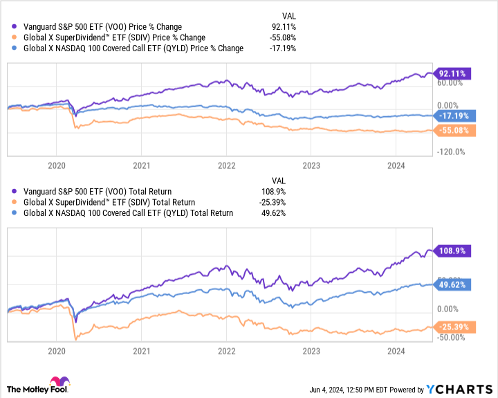 하지만 대부분의 하이일드 배당 ETF는 저가형 S&P500 트래킹 차량에 비해 실적이 좋지 않습니다. 글로벌X슈퍼배당 ETF(SDIV -0.31%)와 글로벌X나스닥100커버드콜 ETF(QYLD 0.23%)가 대표적입니다.
