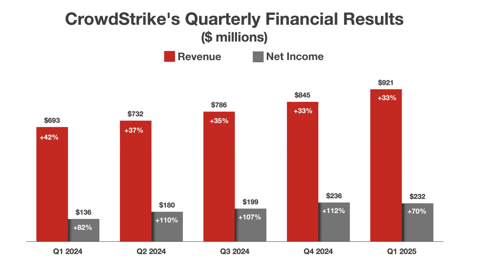 크라우드스트라이크는 2025 회계연도 1분기(4월 30일 종료)에 실적과 수익의 예상치를 뛰어넘은 강력한 재무 실적을 발표했습니다. 매출은 33% 증가한 9억 2,100만 달러, 비회계기준 순이익은 70% 증가한 2억 3,200만 달러를 기록했습니다. 경영진은 2분기에 31%의 매출 성장을 이끌었습니다.