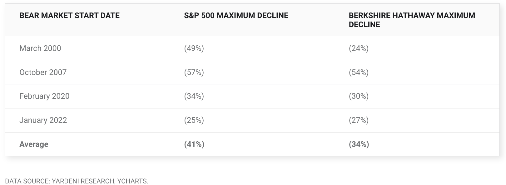 버크셔는 회복력에 있어서 또 다른 중요한 자질을 가지고 있습니다. 그 자회사들은 경쟁적으로 유리한 기업들을 식별하는 요령을 가지고 있는 완전한 투자자인 Buffett에 의해 선정되었을 뿐만 아니라, 그 자회사들의 다양한 성격은 버크셔가 단일 부문이나 산업에 지나치게 의존하지 않는다는 것을 의미합니다. 아래 도표에서 볼 수 있듯이, 그것은 버크셔가 어려운 시장 환경에서 S&P 500을 능가하도록 도왔습니다.