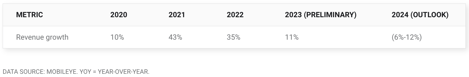 모빌아이(MBLY 3.08%)의 주가는 자동차 칩 제조업체가 2023년 예비 연간 실적과 2024년 전망을 발표한 후 1월 4일 25% 급락했습니다.